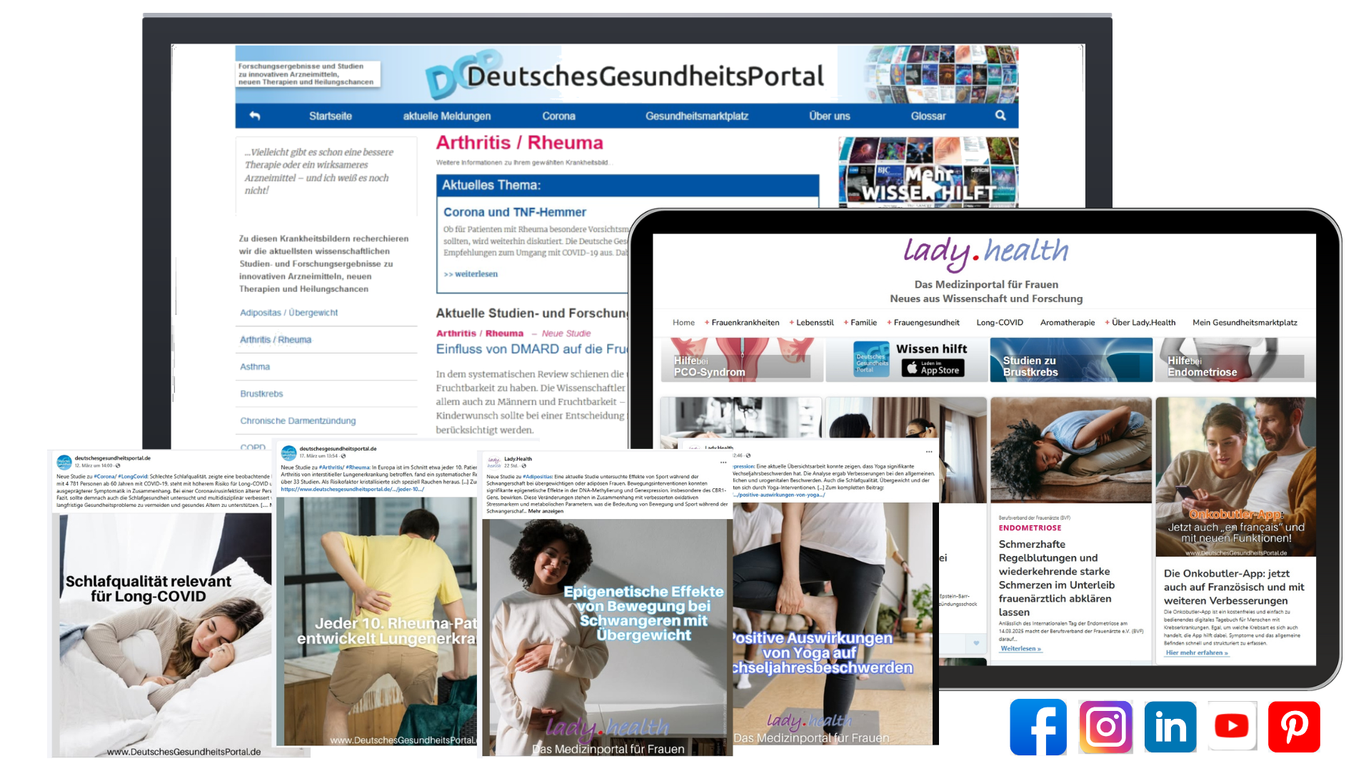 Mit unserem Laienportal DeutschesGesundheitsPortal erreichen wir über 1,3 Mio. Patientinnen, Patienten und Gesundheitsinteressierte. Hinzu kommen diverse indikationsspezifischen Patienten-Newsletter mit Öffnungsraten von bis zu 50 %. Außerdem posten wir therapiebezogene Informationen hochfrequent auf Facebook, Instagram, Google, LinkedIn …